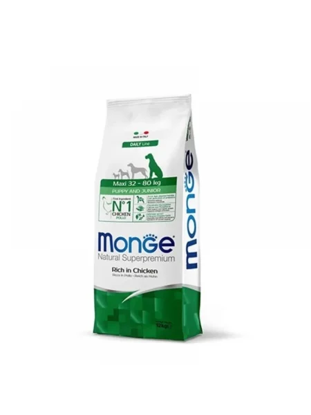 Hrană Monge Câini Superpremium Maxi Puppy & Junior 12 kg cu pui pentru căței de talie mare (32-80kg). Digestie ușoară, dezvoltare articulară sănătoasă, creștere echilibrată. Fabricat în Italia.