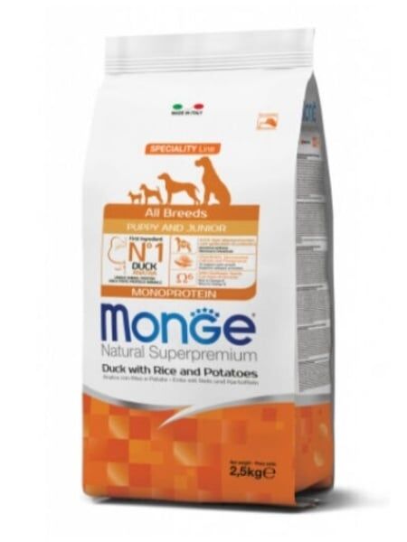 Monge Câini Superpremium Puppy Rață, Orez și Cartofi 2,5 kg este o hrană uscată de calitate superioară, concepută special pentru puii de câine aflați în perioada de creștere. Formula este bogată în proteine ușor digerabile din carne de rață, carbohidrați sănătoși din orez și cartofi și un mix echilibrat de vitamine și minerale esențiale.