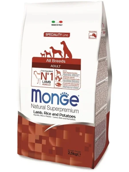 Monge Câini Superpremium Toate Rasele – Miel, Orez & Cartofi pentru Adulți este o hrană uscată superpremium, formulată special pentru câinii adulți de toate rasele. Această rețetă monoproteică, având mielul ca singură sursă de proteină animală, este ideală pentru câinii cu sensibilități digestive sau alergii alimentare.